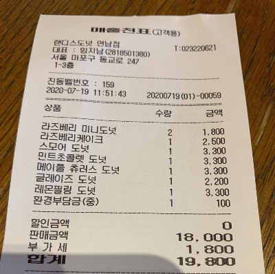 제가 구매한 도넛 목록과 영수증 첨부입니다 ㅎㅎ